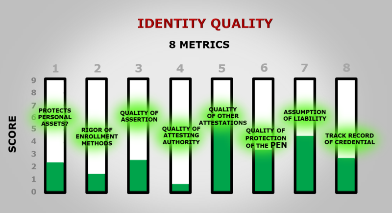 Whenever and wherever the credential is presented, the aggregate Identity Quality score and its eight component scores are presented, letting the relying party know the degree to which the identity claim can be relied upon.