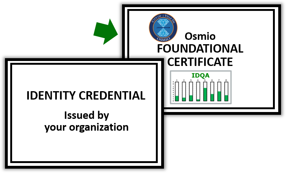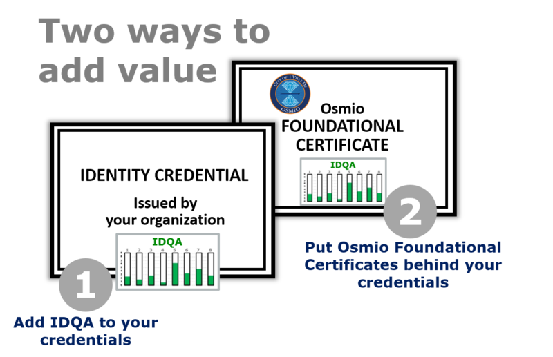 Whether you apply IDQA™ directly to your own credential, or you put an Osmio Foundational Certificate behind your credential, you’ll give relying parties (including your own organization) an unmatched level of assurance that users are who they claim to be.